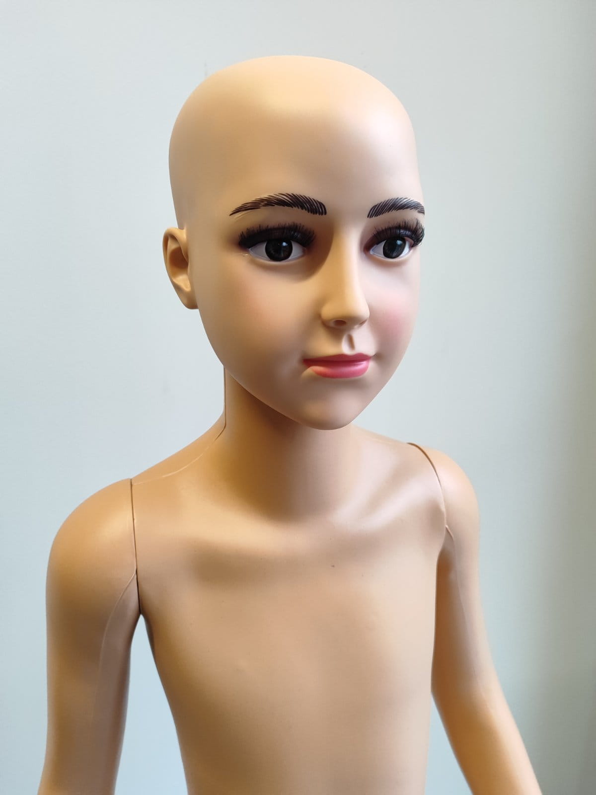 Materiał i Funkcje: Nasz manekin dziecięcy wykonany jest z trwałego tworzywa sztucznego o kolorze cielistym, co nadaje mu naturalny wygląd. Posiada wyrazistą twarz, która dodaje postaci uroku i autentyczności.