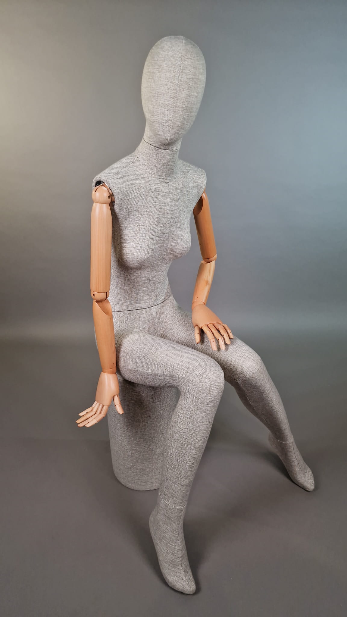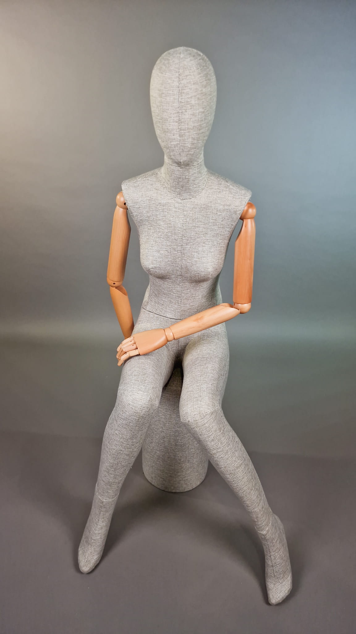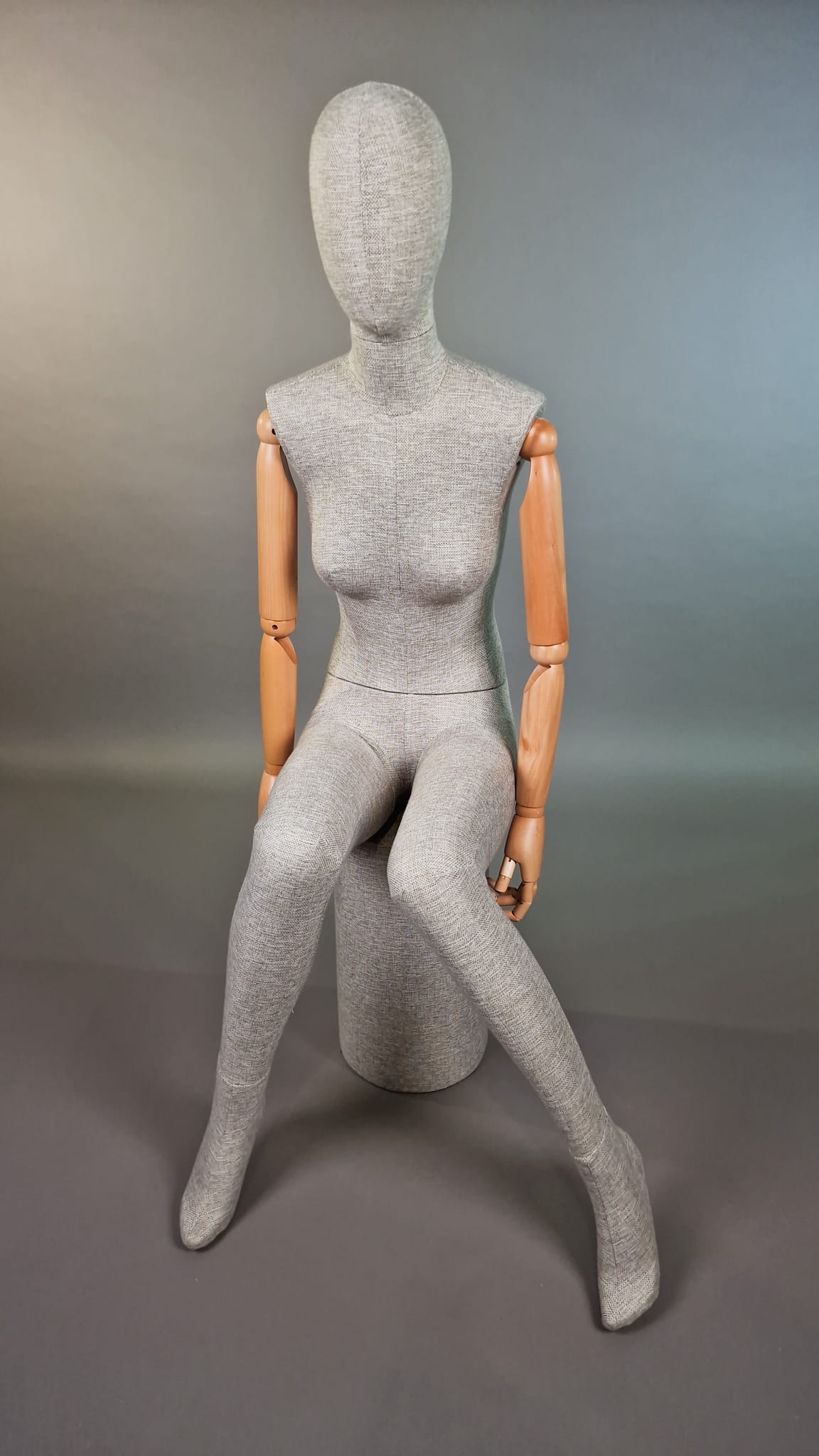 Nowoczesny damski manekin T71 całopostaciowy (pozycja siedząca) – lniana tkanina, ruchome drewniane ramiona