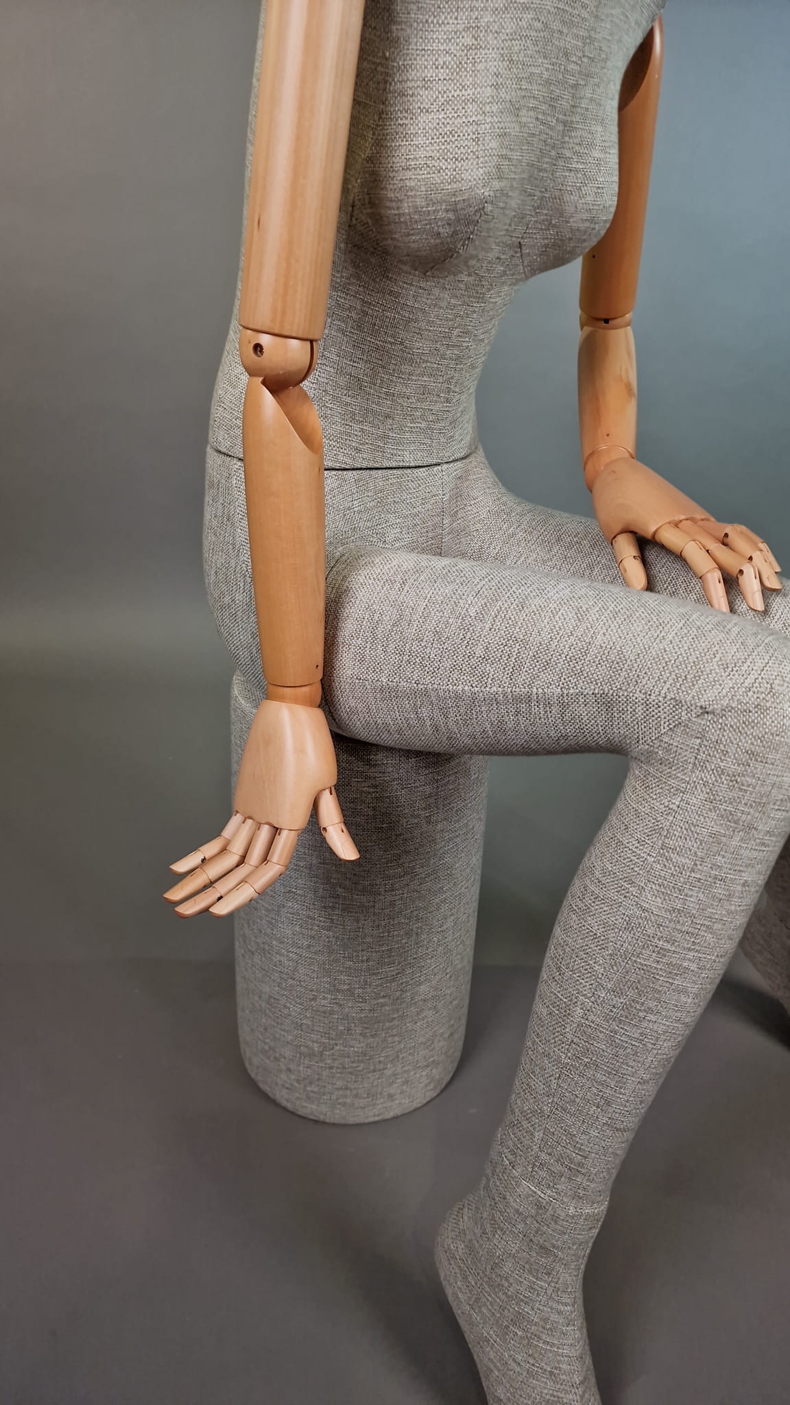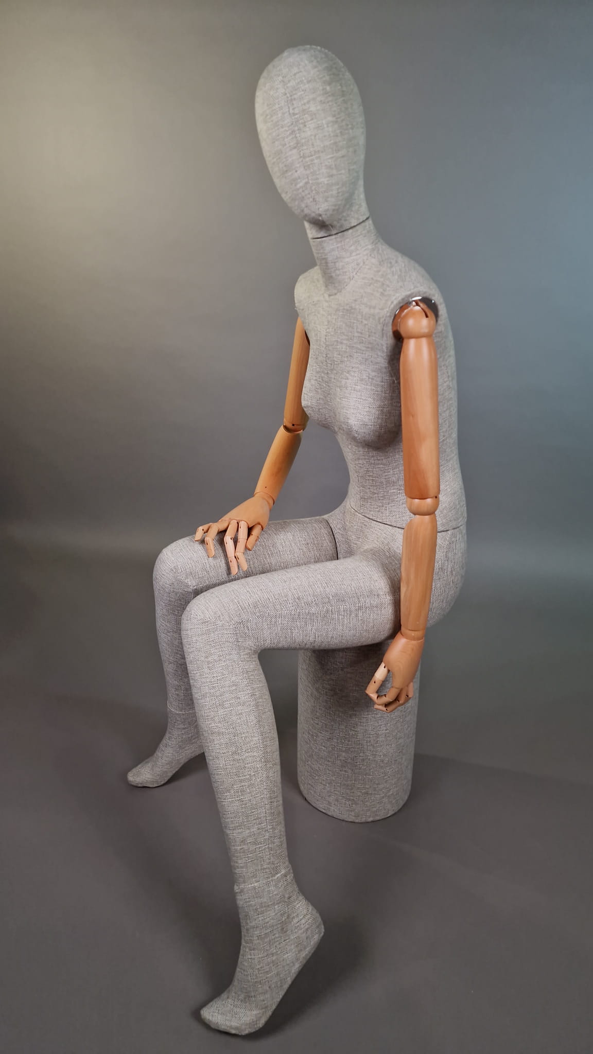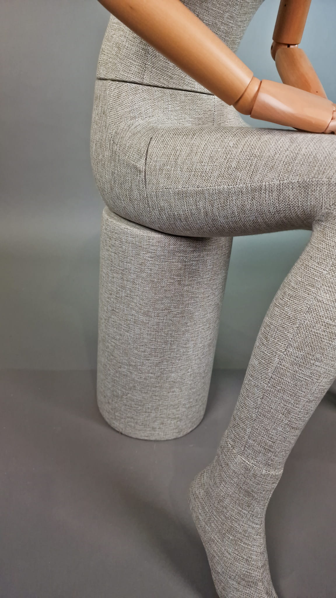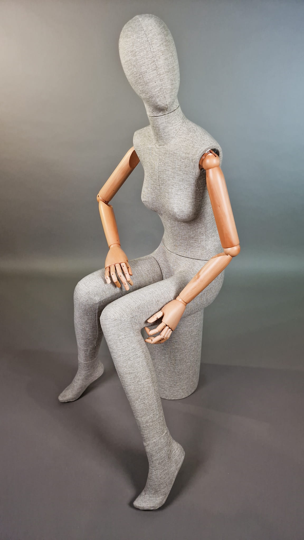 Nowoczesny damski manekin T71 całopostaciowy (pozycja siedząca) – lniana tkanina, ruchome drewniane ramiona
