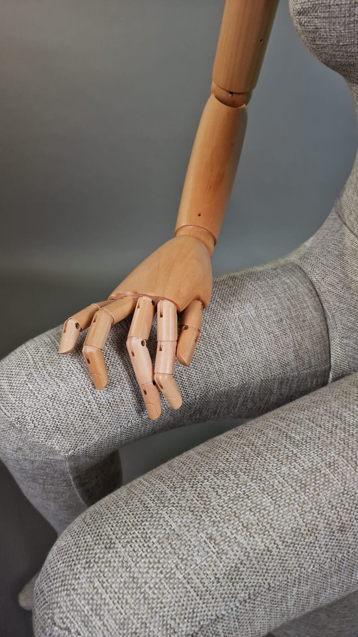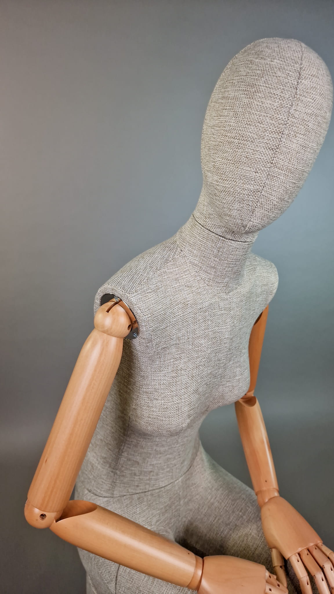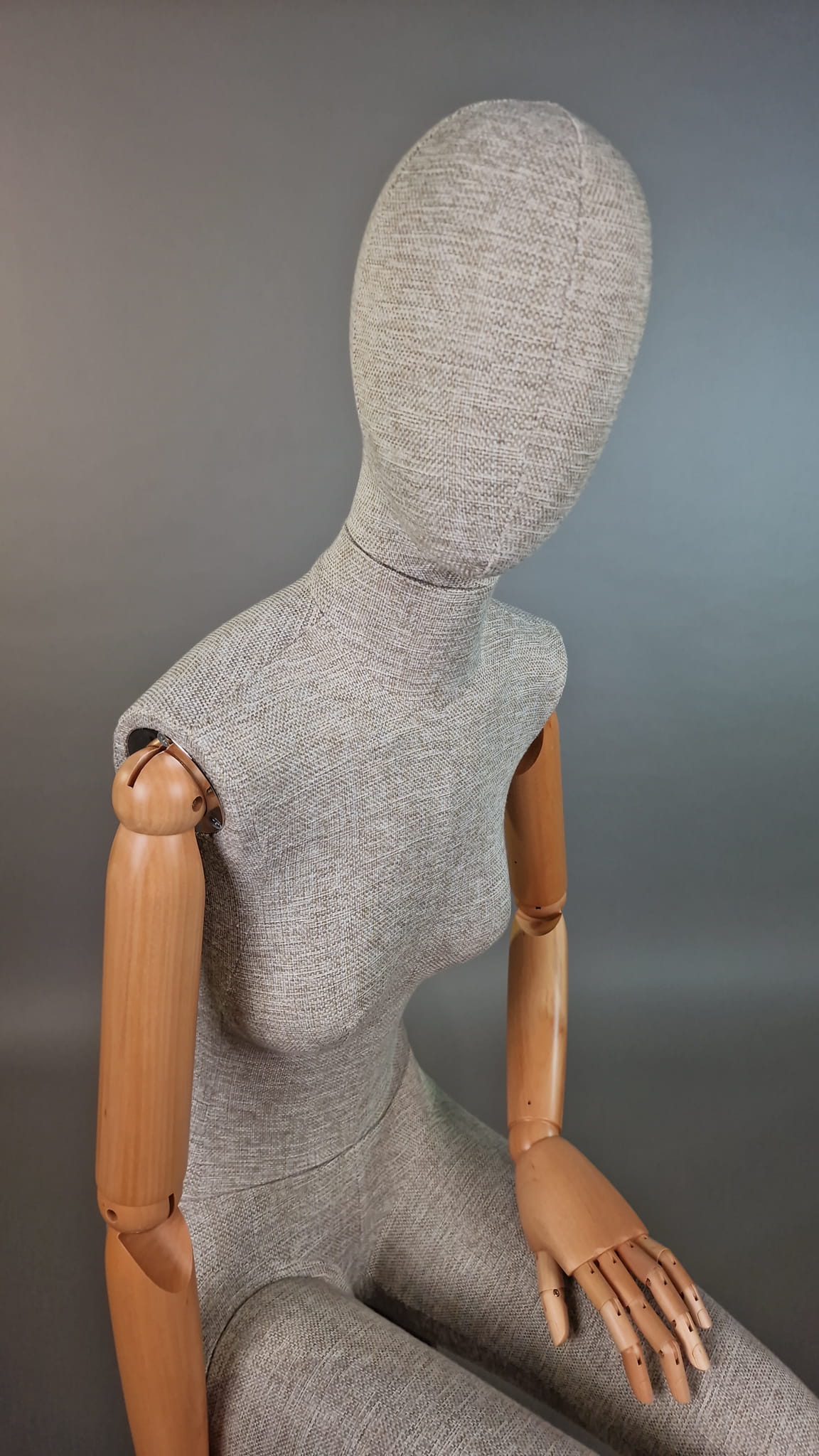 Przedstawiamy elegancki, nowoczesny manekin damski T71 w pozycji siedzącej, idealny do prezentacji odzieży. Korpus obity lnianą tkaniną i ruchome drewniane ramiona nadają mu wyjątkowy charakter, doskonale komponując się z różnymi stylami butików i salonów mody.