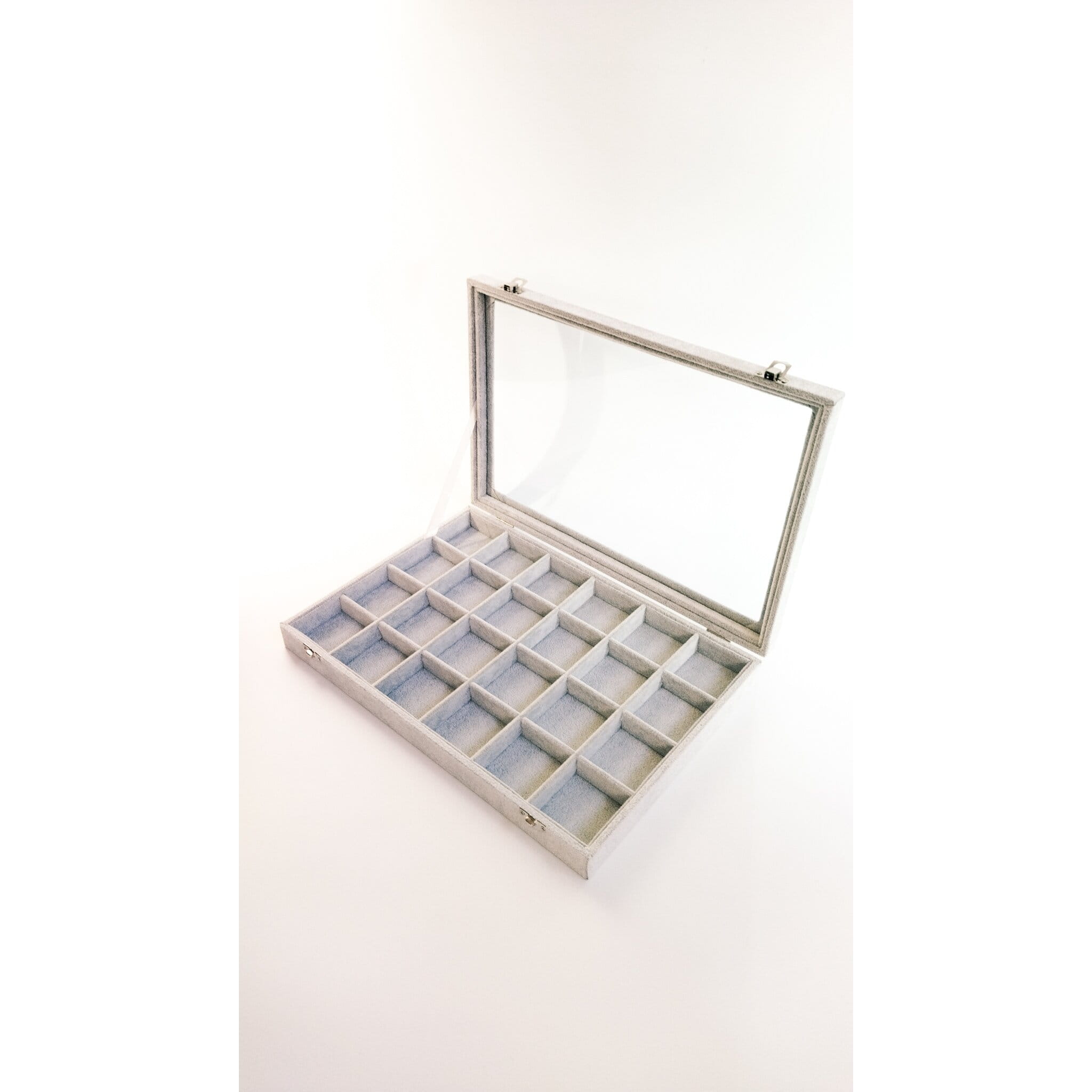 Pudełko na biżuterię i biżuterię - 24 komórki, szary welur. Szklana pokrywa.