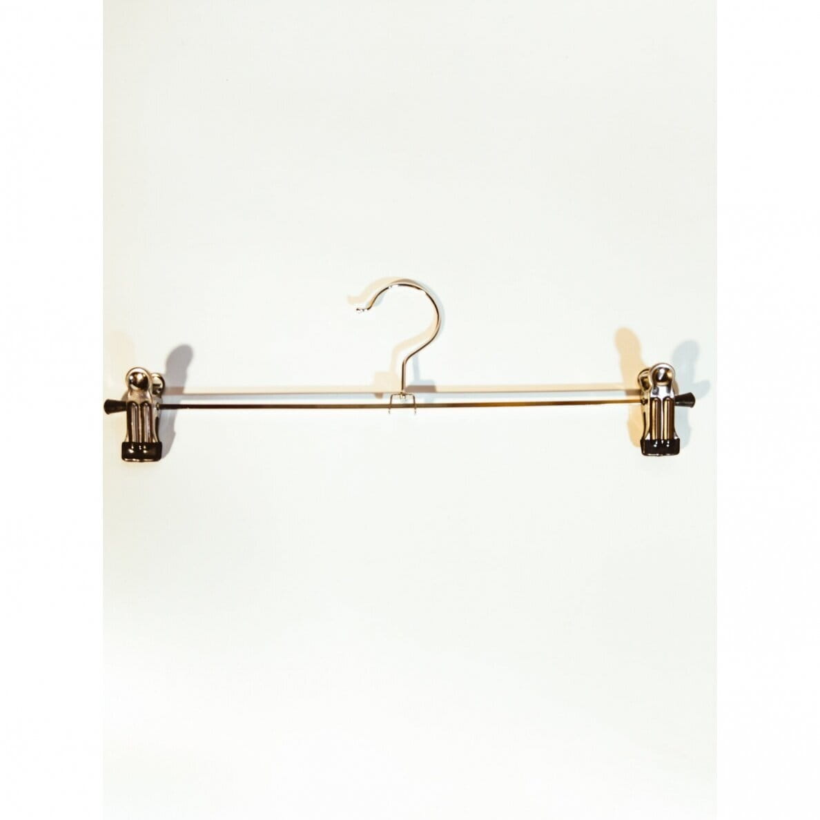 Wieszak na ubrania, spodnie, pasmanterię .Metalowy, 2 solidne klipsy z uszczelką z gumy. Długość 13 cm